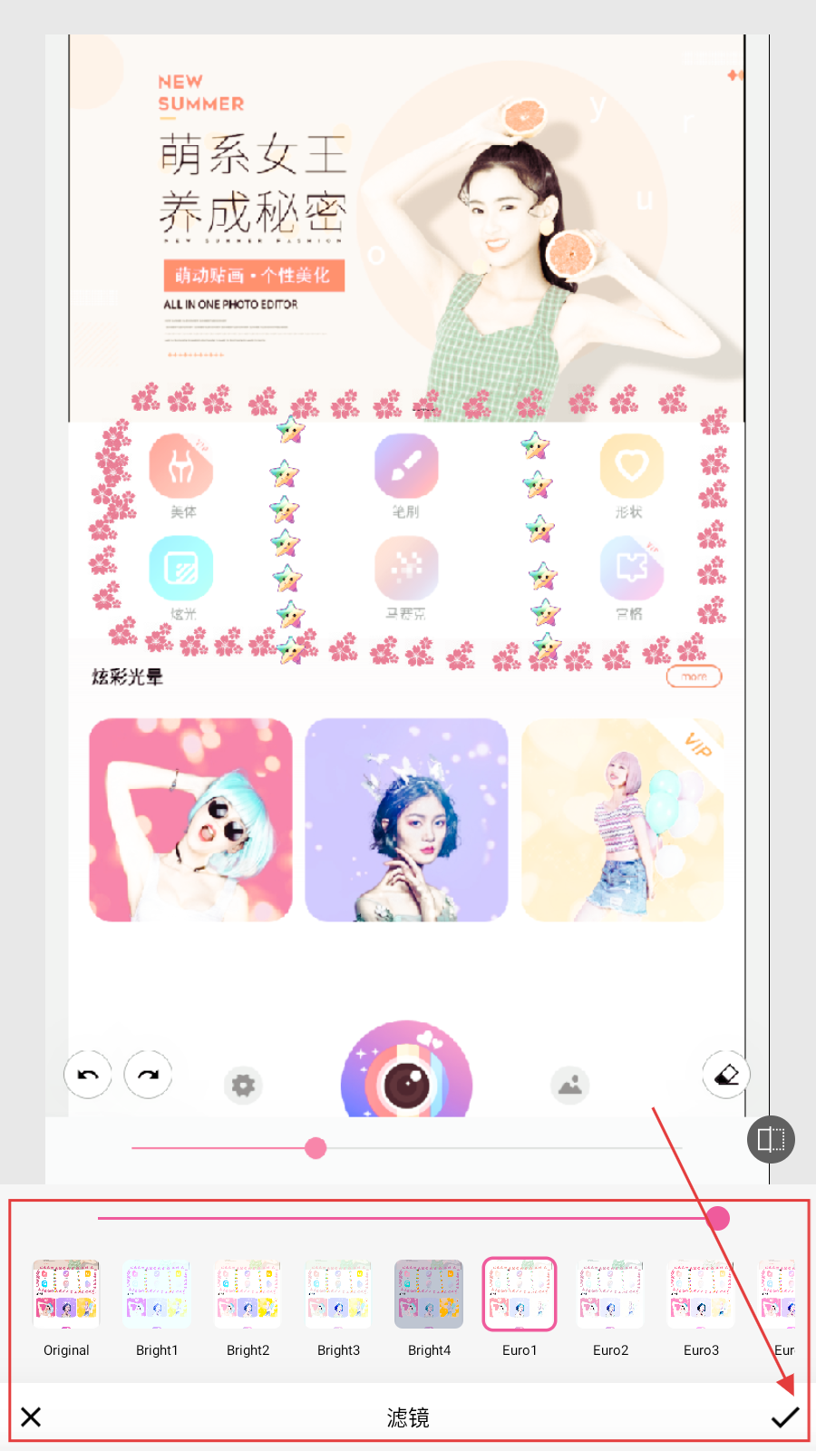 3、切换到滤镜页,选滤镜样式(如Euro1),调强度,点确认应用,完成图片美化。
