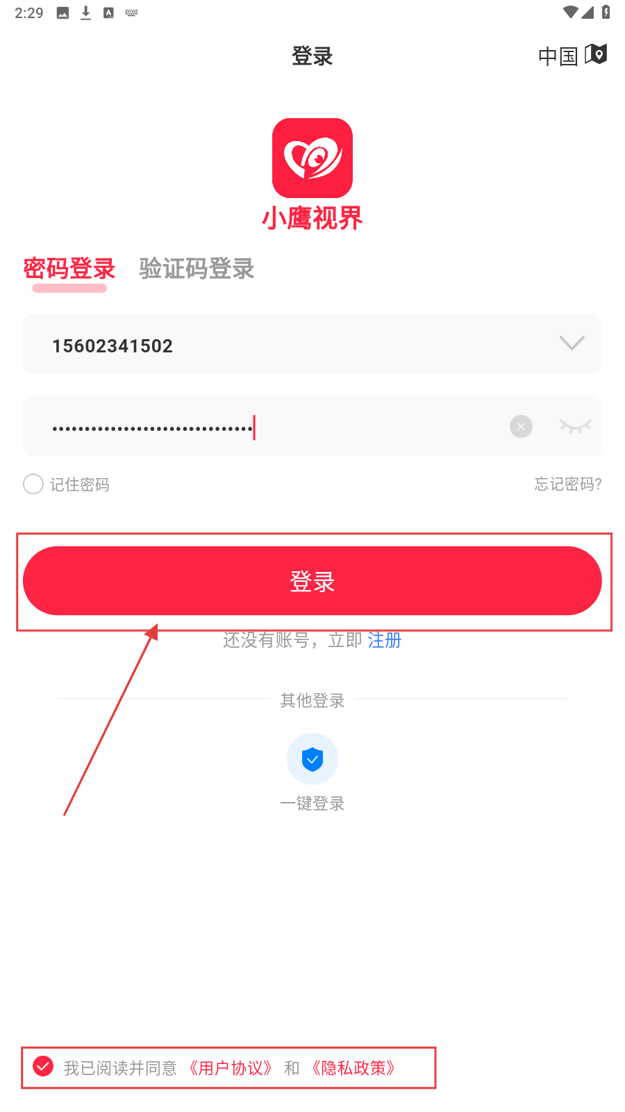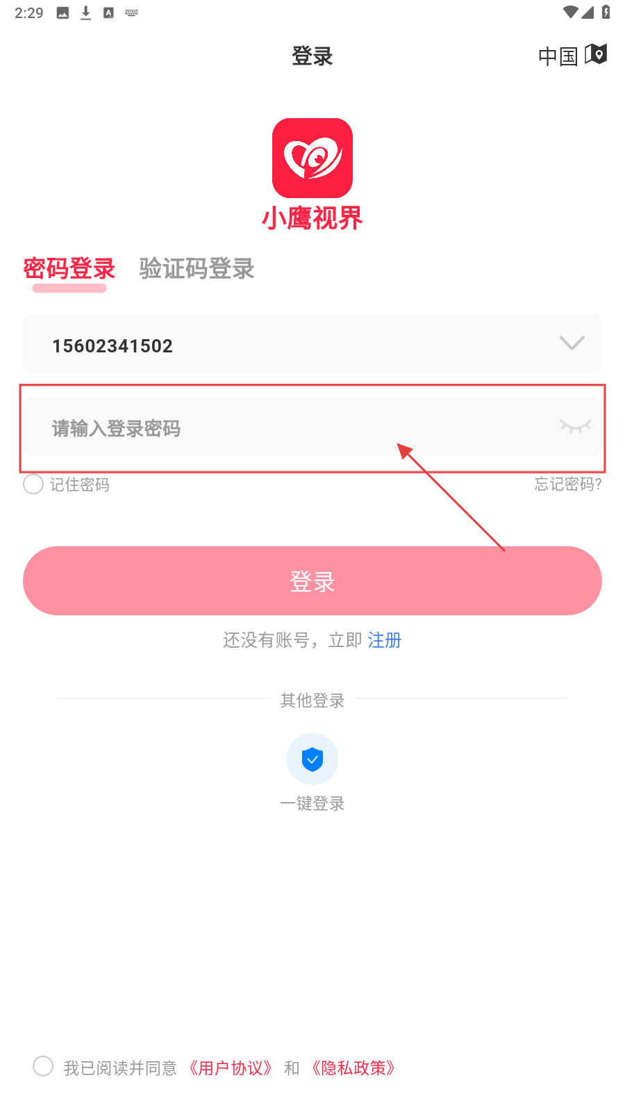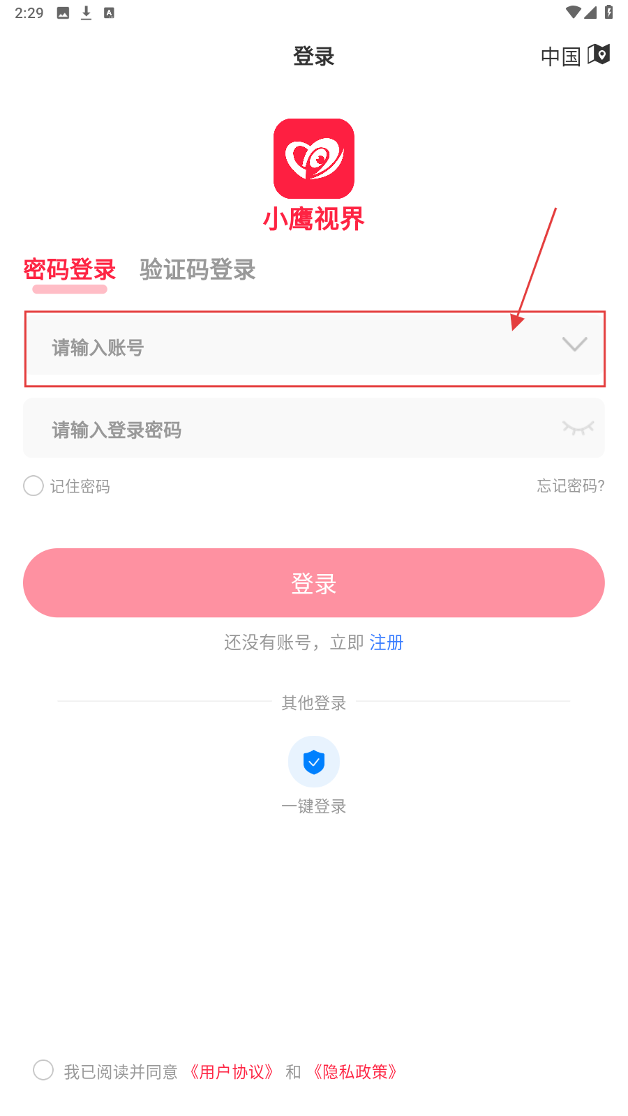 1、打开“小鹰视界”APP登录页,选【密码登录】,在账号框输入账号。