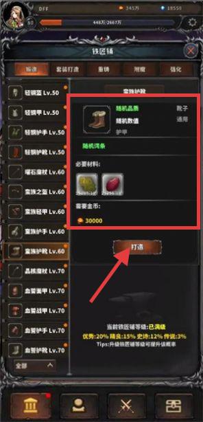 2、在铁匠铺可打造装备,了解装备所需随机品质、材料,收集资源打造适合角色等级的装备,提升防御和属性。