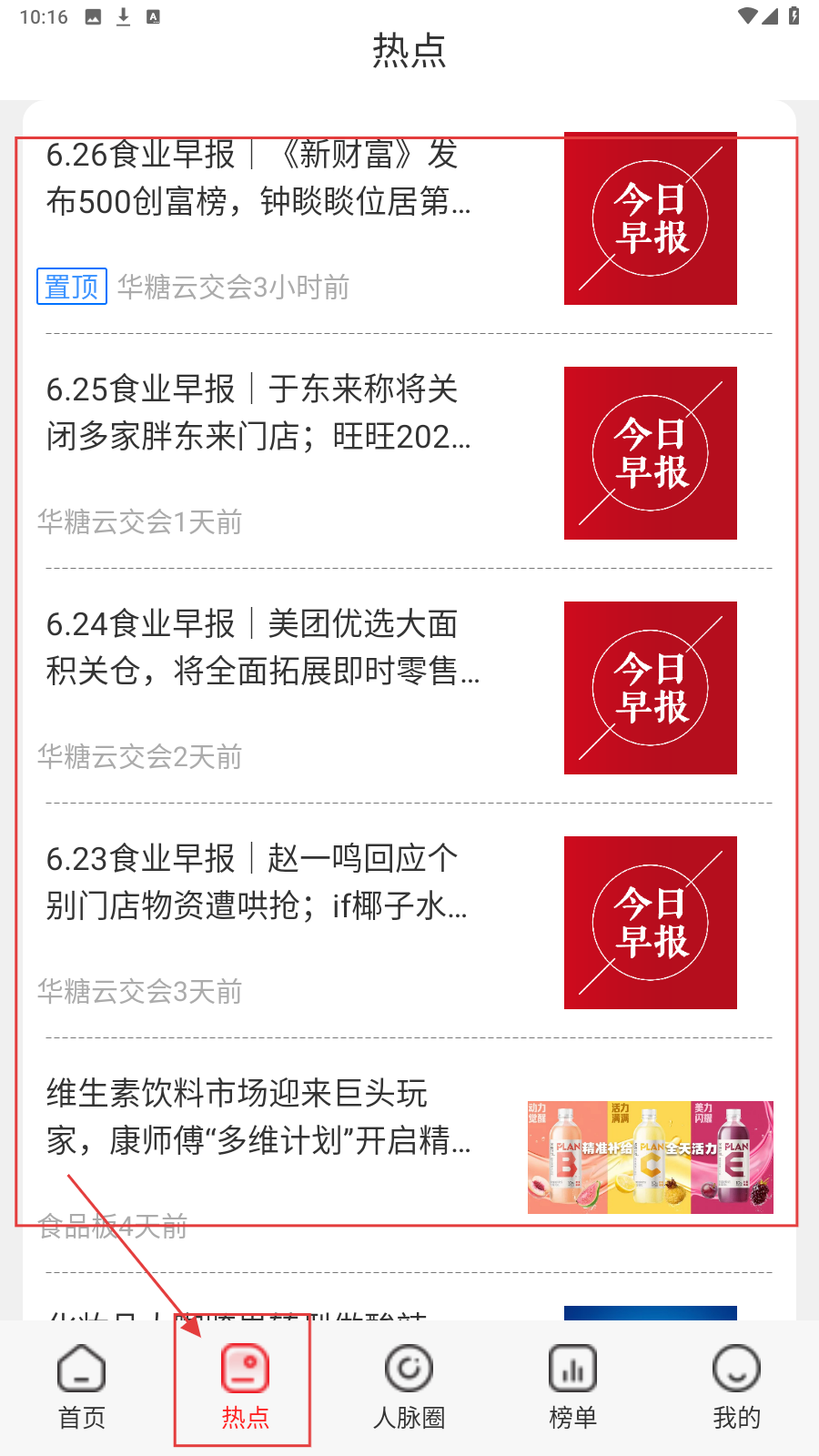 2、点击底部【热点】,查看食业早报、行业资讯,了解胖东来门店、美团优选动态等。