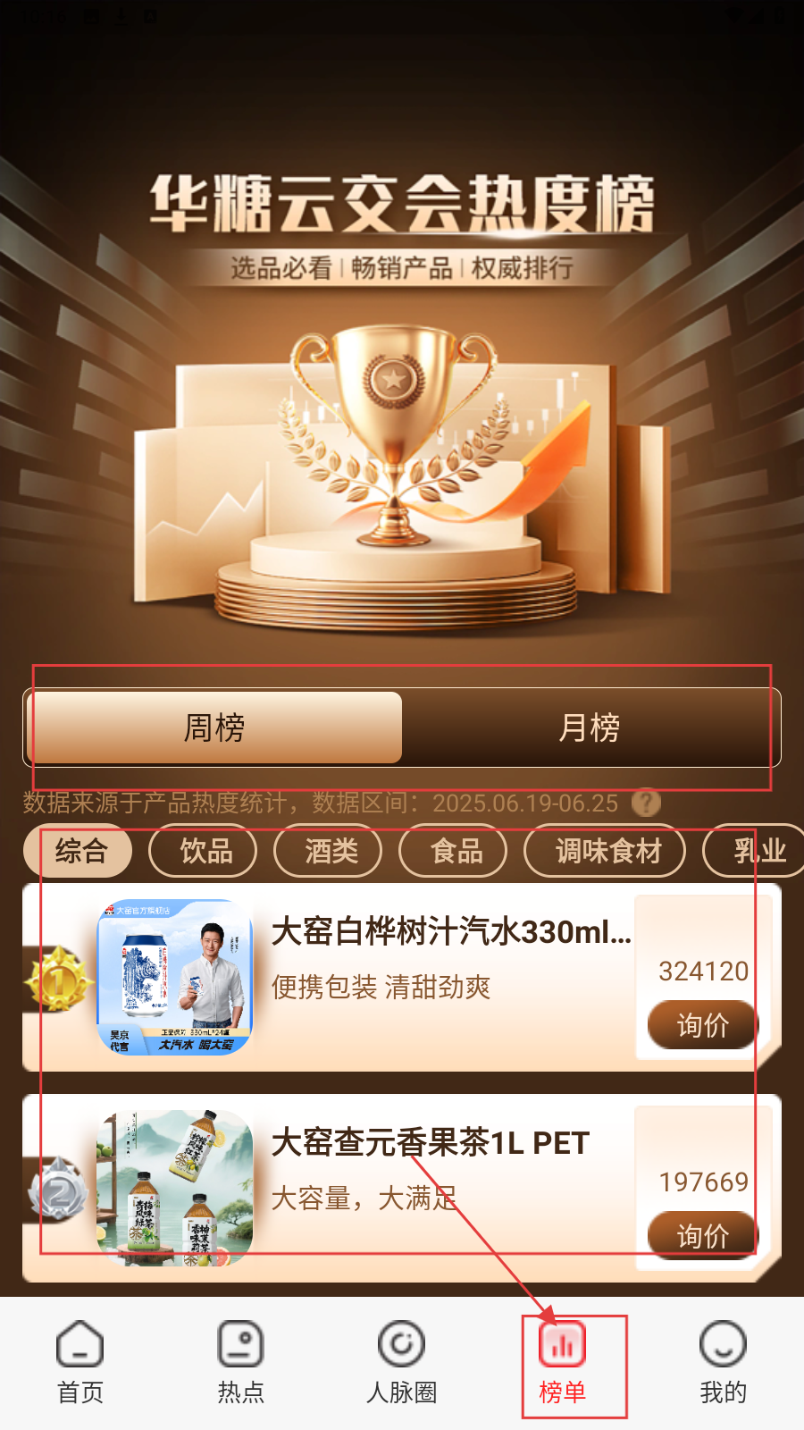 3、切换到【榜单】,查看华糖云交会热度榜,选周榜/月榜、综合/饮品等分类,浏览大窑白桦树汁汽水等畅销产品及热度数据,按需询价。
