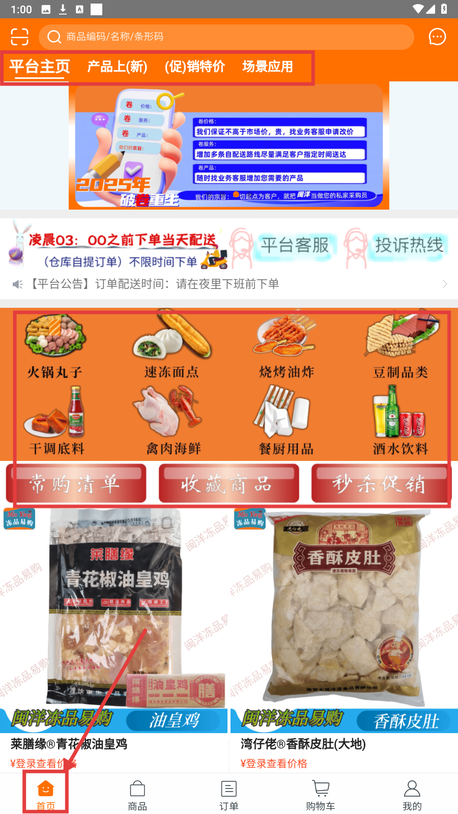 1、进入【首页】,浏览火锅丸子、速冻面点等分类,查看常购清单、秒杀促销,搜索商品,了解配送公告。