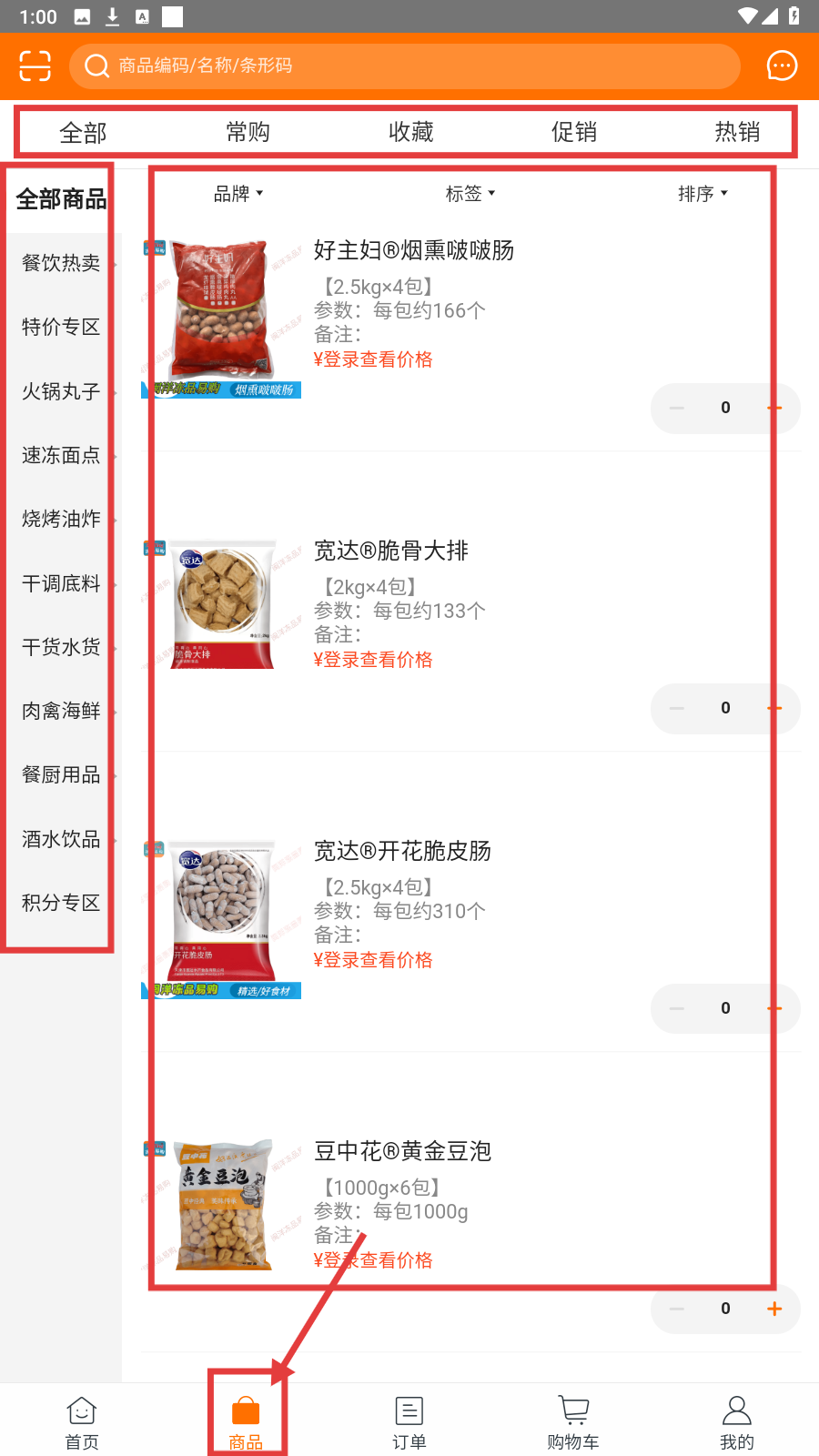 2、切换【商品】页,按全部、常购等分类,选餐饮热卖、火锅丸子等品类,浏览好主妇啵啵肠等商品,可筛选品牌、排序。