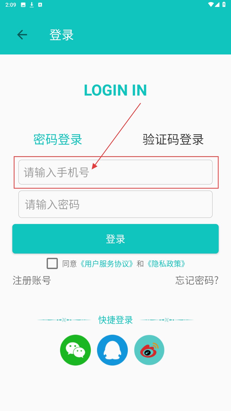 3、点击【登录】完成登录;也可切换【验证码登录】或用快捷登录(微信、QQ、微博)。