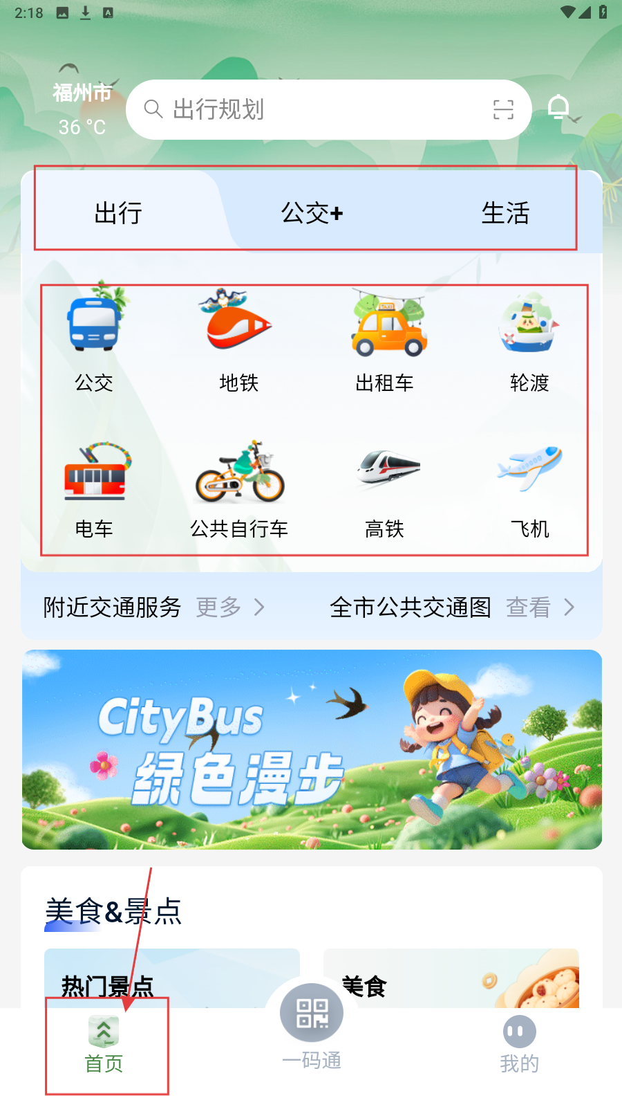 1、进入【首页】,选城市,用出行规划搜索,点公交、地铁等图标选交通方式,可以查看附近交通、交通图。