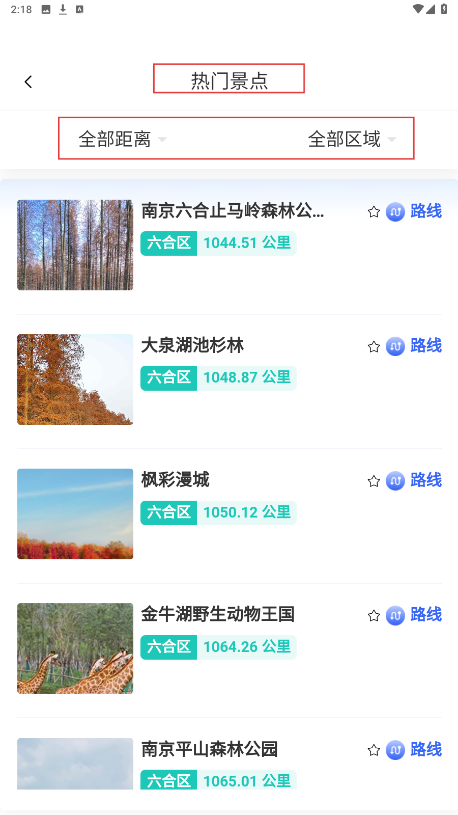 2、从首页进入【热门景点】页面,有“全部距离”“全部区域”筛选条件,点击“路线”可规划前往路径。