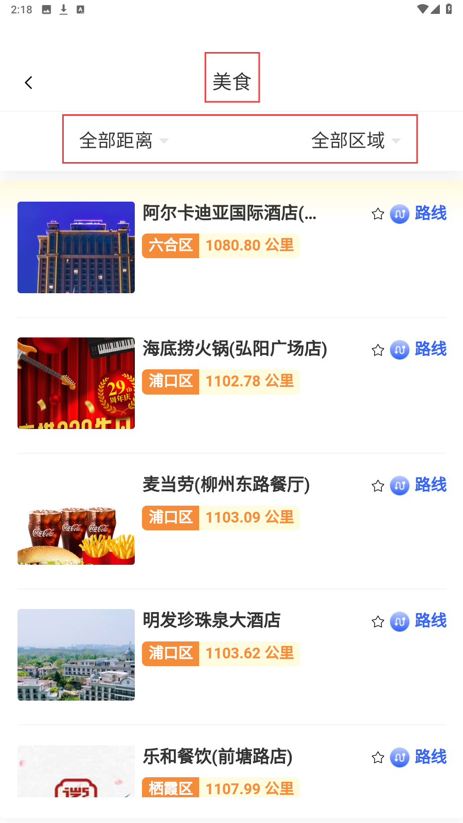 3、切换至【美食】页面,通过“全部距离”“全部区域”筛选,点“路线”可跳转导航参与。
