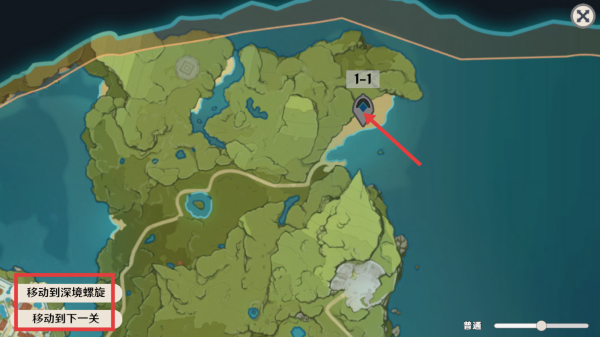 1、查看地图,通过“移动到下一关”切换关卡。若开启“深境螺旋”,可点击“移动到深境螺旋”挑战,获取丰厚奖励。