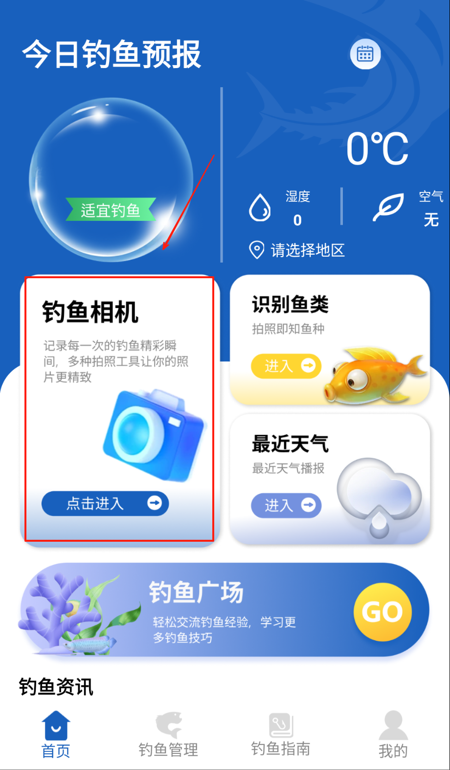 1、钓获后点击相机图标拍摄鱼体侧面,AI自动识别鲫鱼鲤鱼等品种并显示生长周期与保护等级,点击保存生成带GPS坐标的电子鱼拓哦。