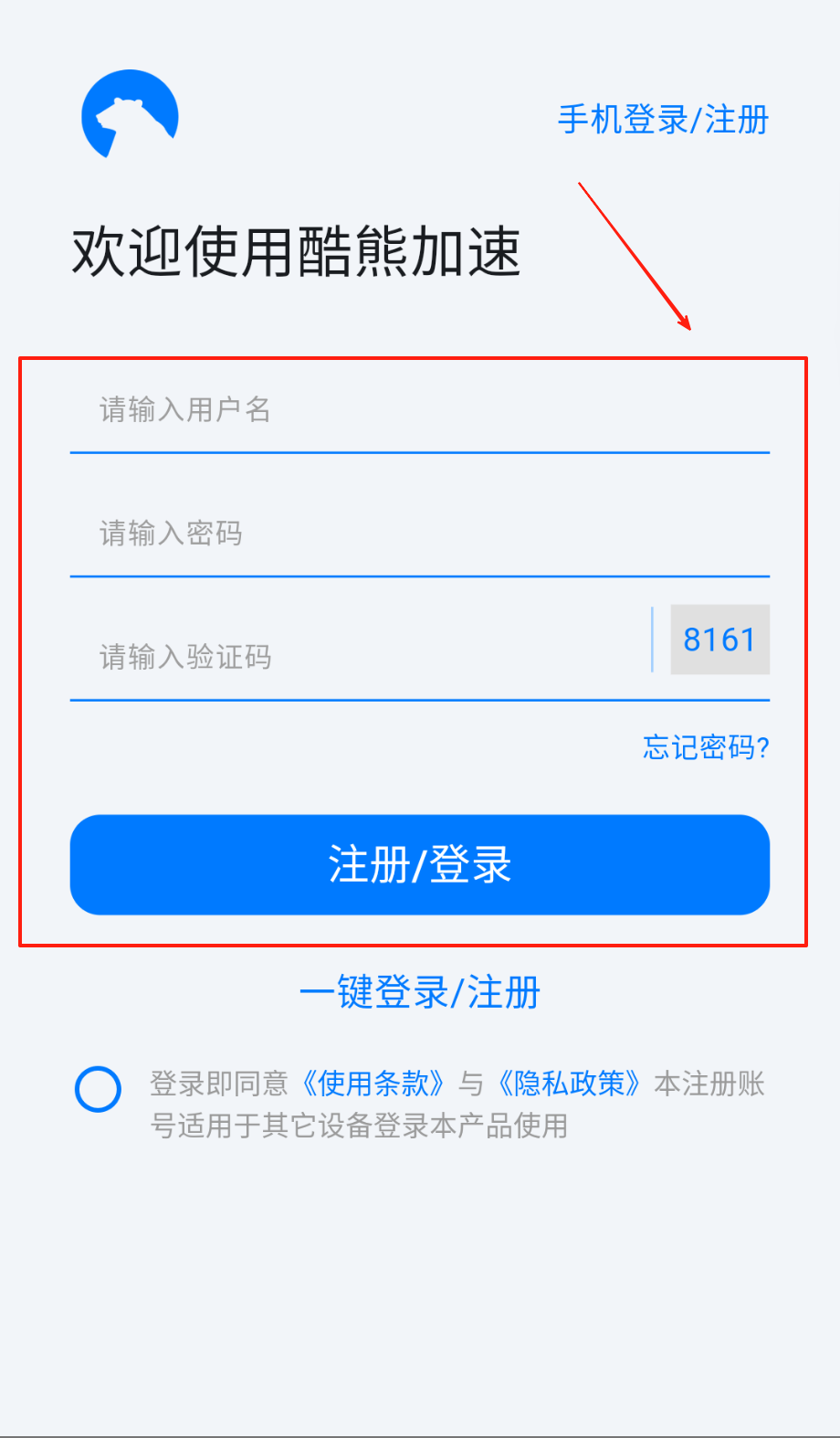 1、打开软件看到手机登录注册界面,浅色背景顶部有蓝熊标志,依次填用户名密码和验证码8161,点蓝色注册登录按钮完成操作呀。