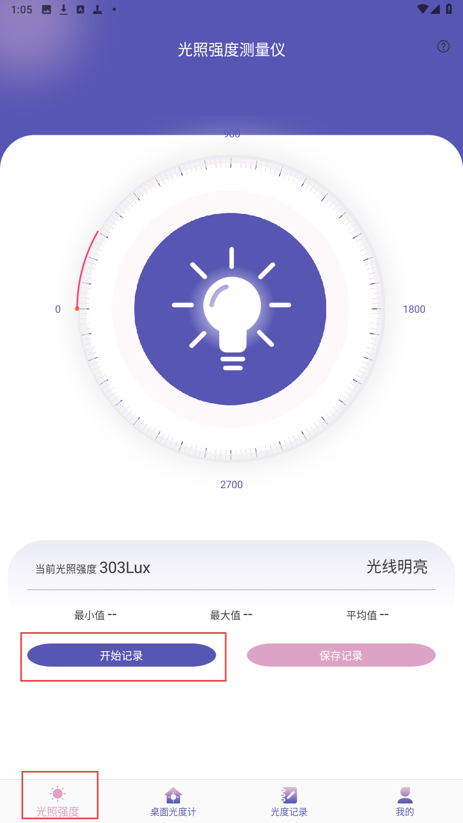 1、进入“光照强度测量仪”应用的【光照强度】页,当前光照303Lux(光线明亮),点击【开始记录】,仪器采集光照数据。