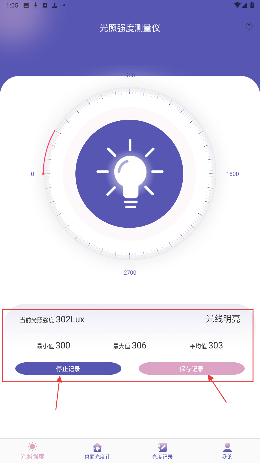 2、记录中,显示当前光照302Lux、最小值300、最大值306、平均值303,点击【停止记录】结束采集,点【保存记录】存数据。
