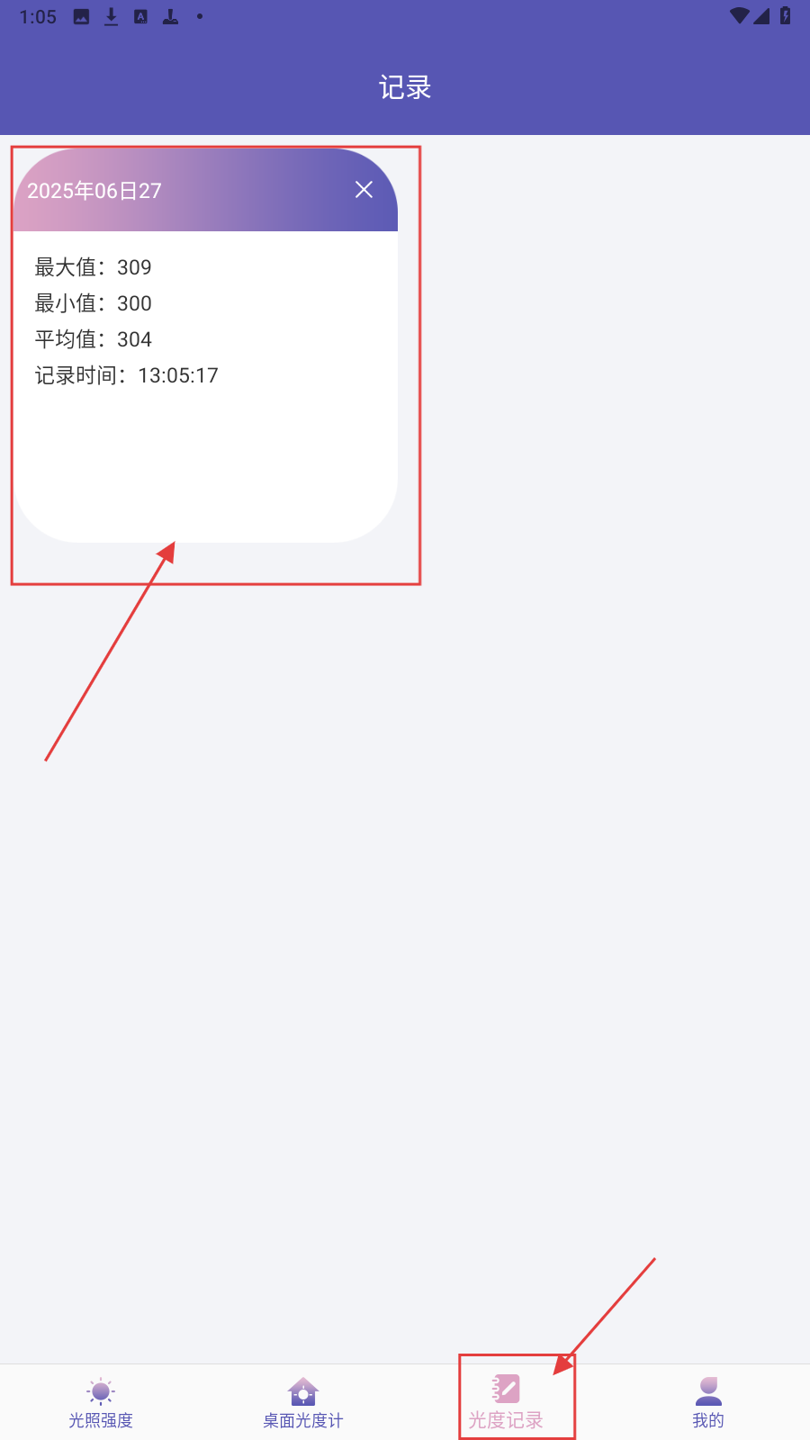 3、切换到【光度记录】页,查看保存的记录,按需管理/查看历史光照数据,底部切“桌面光度计”“我的”功能。