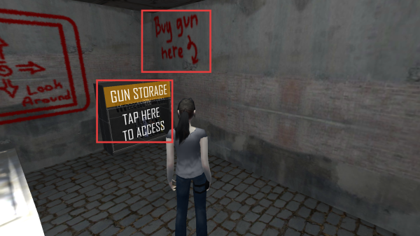 3、看到标识,找到枪械购买处获取武器,点击“GUNSTORAGE”存取枪械,强化战斗能力。在游戏中不断探索场景、获取资源、提升装备。