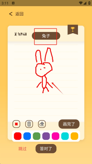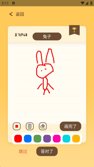 3、进行绘画:在绘画界面,根据关键词绘制图画,完成后点击“画完了”按钮提交。