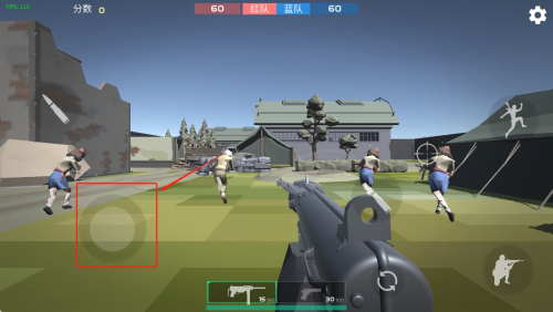 2、如何控制角色?使用屏幕上的虚拟摇杆控制角色移动,寻找敌人。