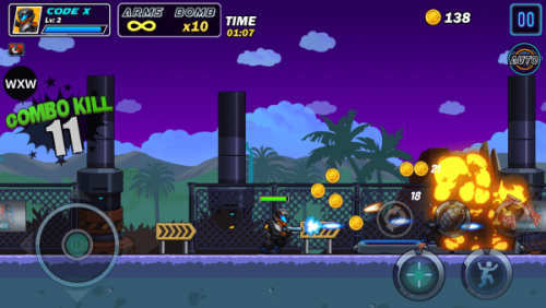 1、热血跑轰体验:横版射击一路狂奔,不断遭遇敌人,疯狂射击突破重围,肾上腺素直线飙升。