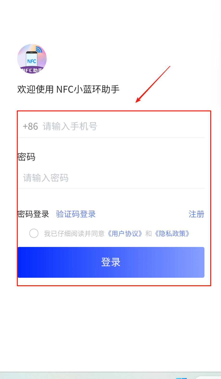 1、打开软件看到登录界面,输+86开头的手机号和密码,勾选同意"用户协议"那行灰色小字,点蓝色登录按钮进系统哦。