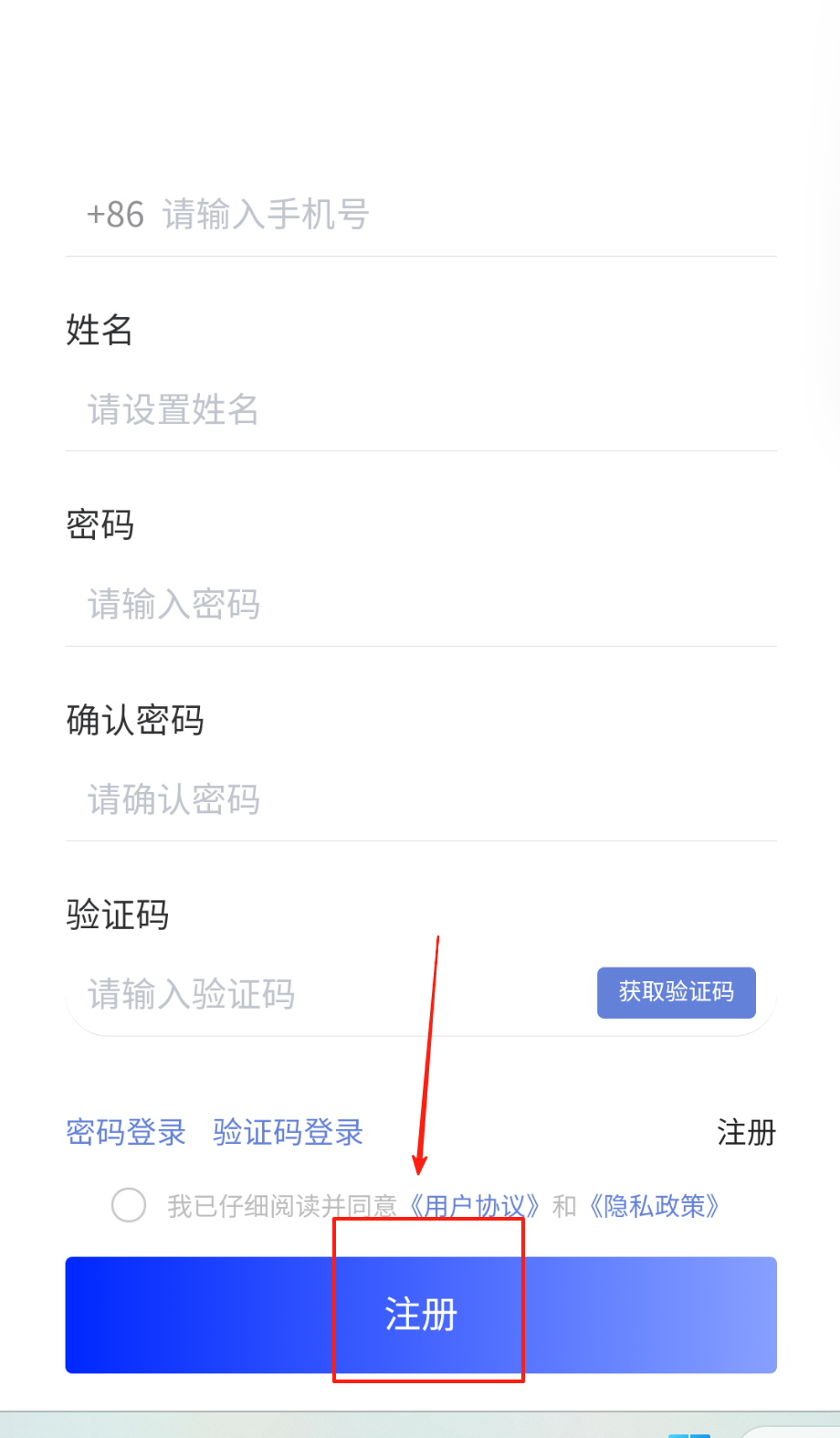 3、注册页填手机号设姓名和密码,验证码框点获取收短信,确认密码一致点注册就能立即使用呀。