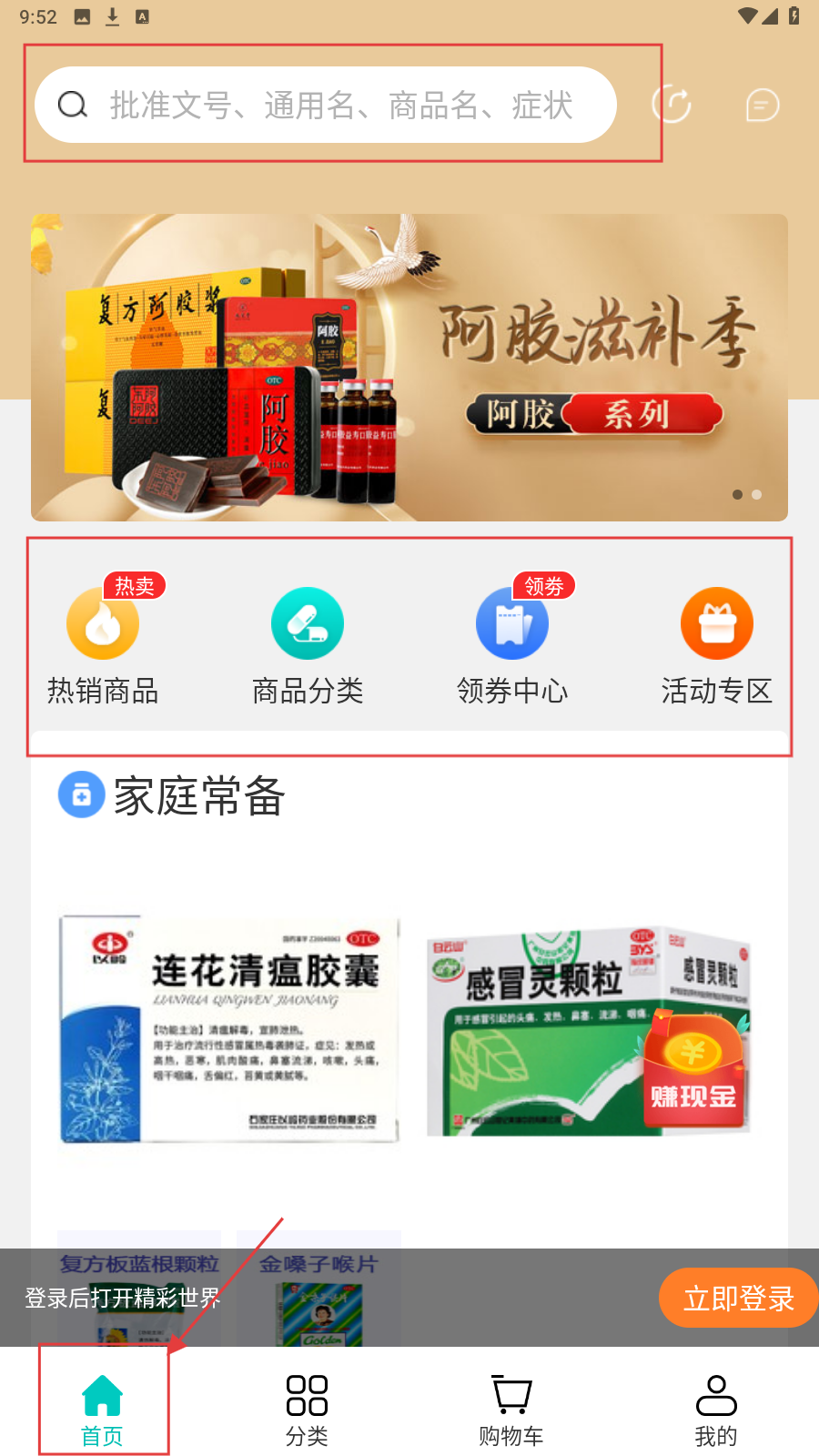 1、在【首页】用搜索栏搜药品,点“热销商品”“商品分类”等找药品,浏览“阿胶滋补季”活动,底部切“分类”“购物车”。