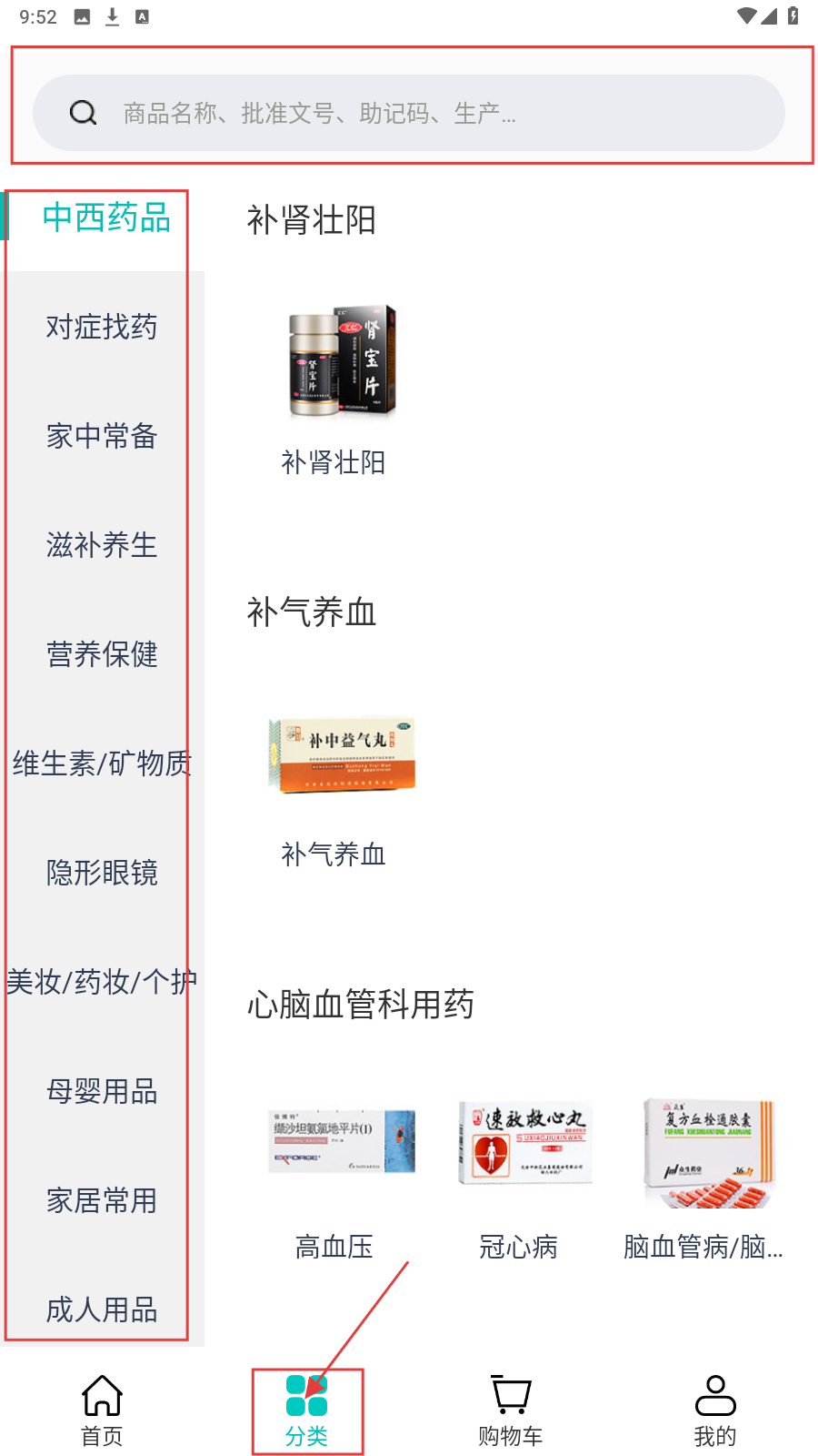 2、切换到【分类】页,从“中西药品”等分类(对症找药、家中常备等)选药品,如“补肾壮阳”“补气养血”类,查看商品列表。