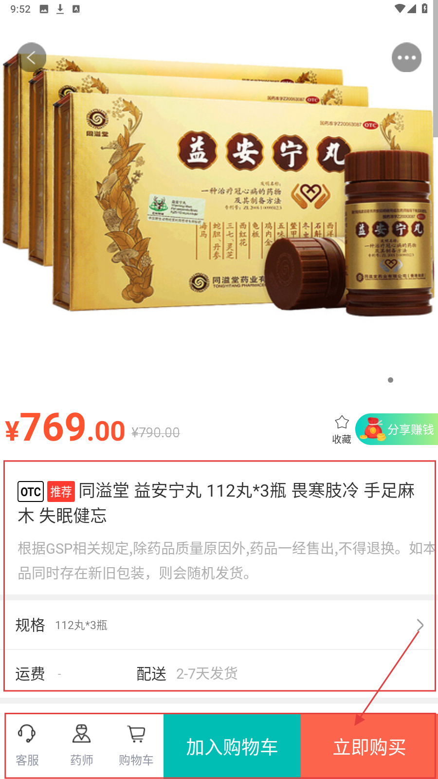 3、进入药品详情,看价格、规格、配送,点【立即购买】下单,或【加入购物车】后续结算。