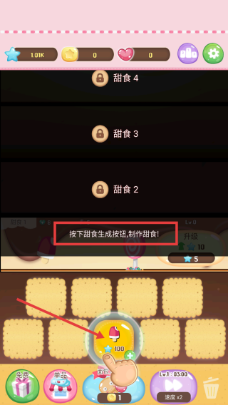 1、游戏开始,根据“按下甜食生成按钮,制作甜食!”提示,点击甜食生成按钮(带有冰淇淋图标),消耗一定星星制作甜食。