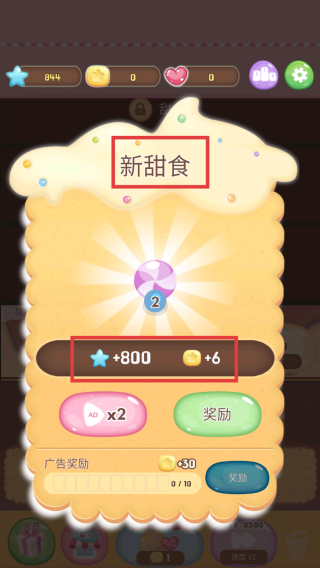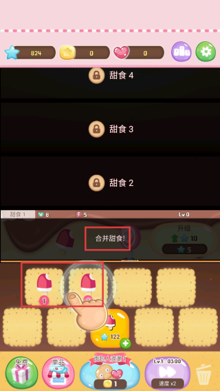 3、合并出“新甜食”可获取奖励,积累资源用于解锁更高关卡(甜食2-甜食4)。持续制作、合并甜食,获取奖励,推进游戏进程。