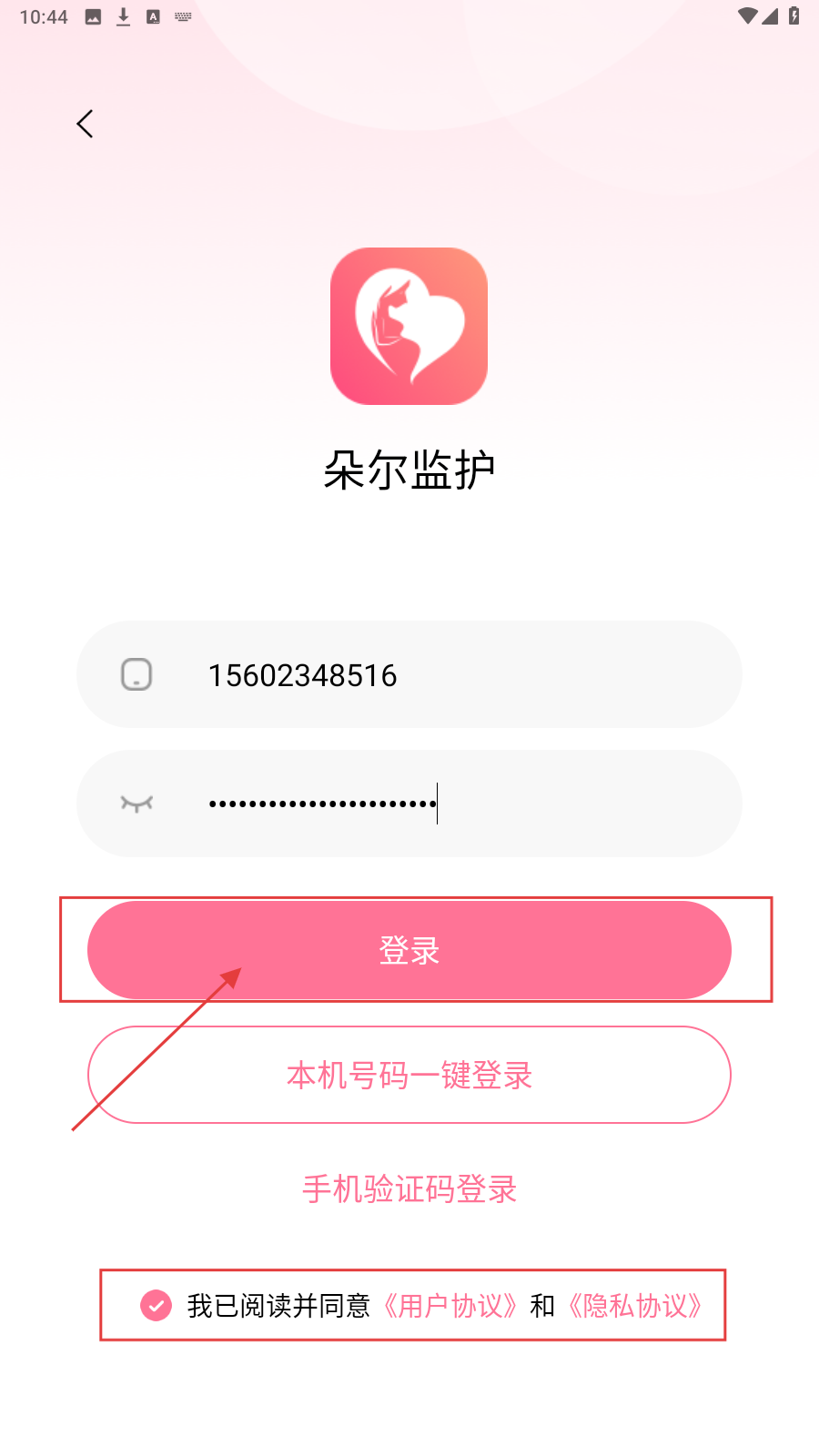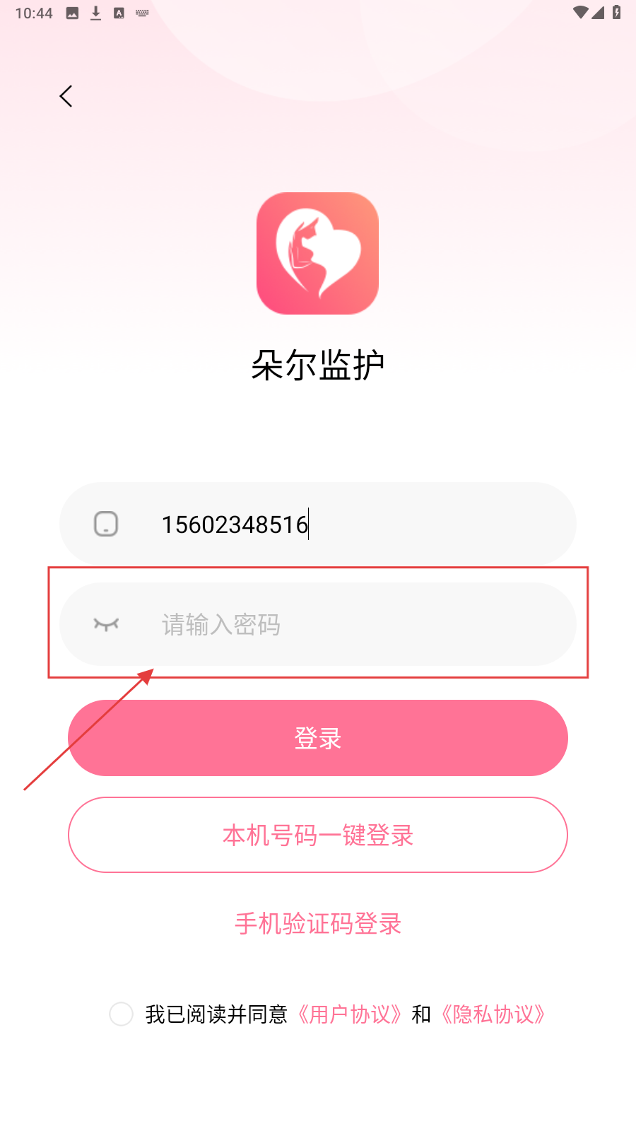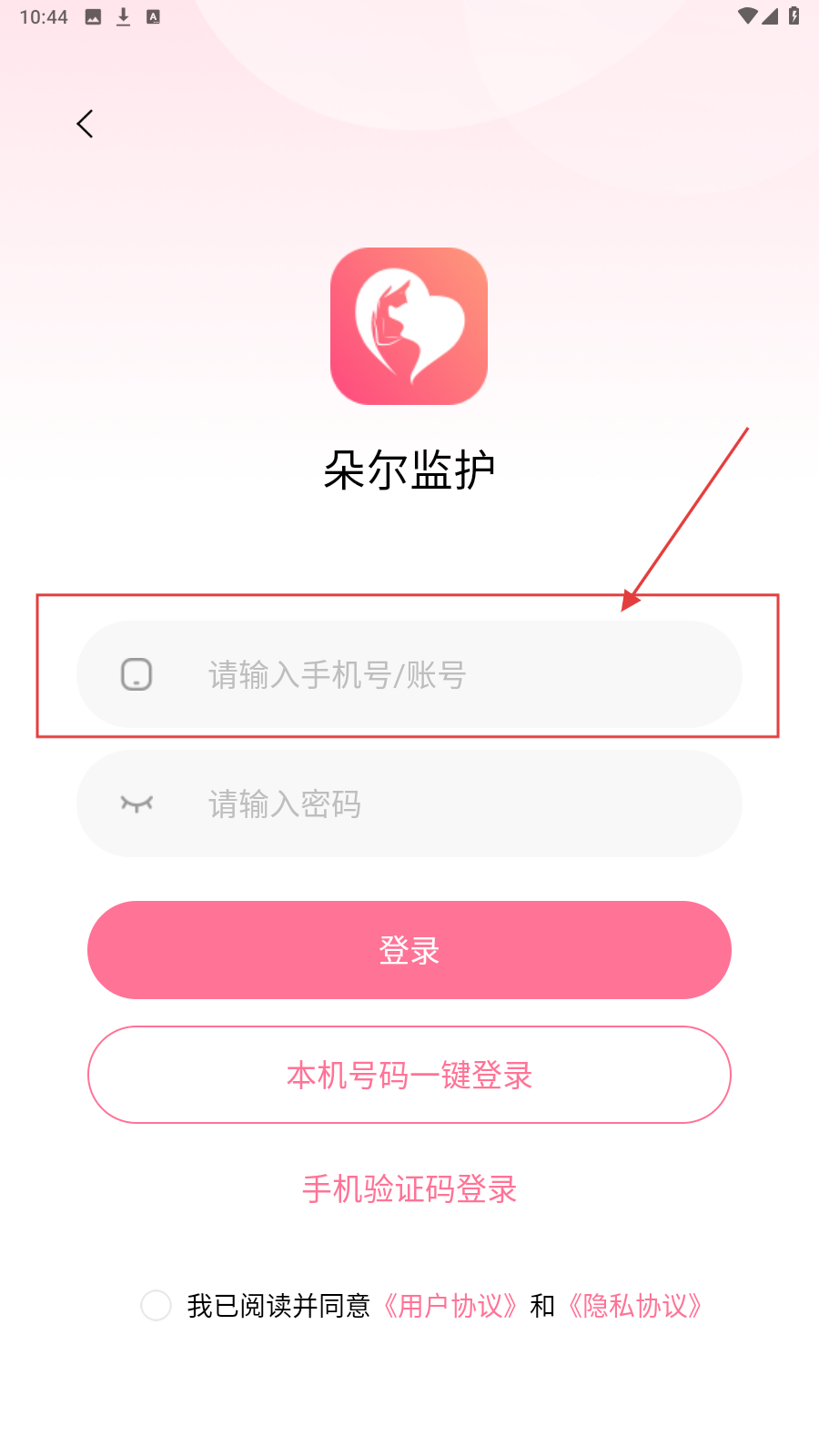 1、打开“朵尔监护”APP登录页,点击【请输入手机号/账号】框,填入号码。
