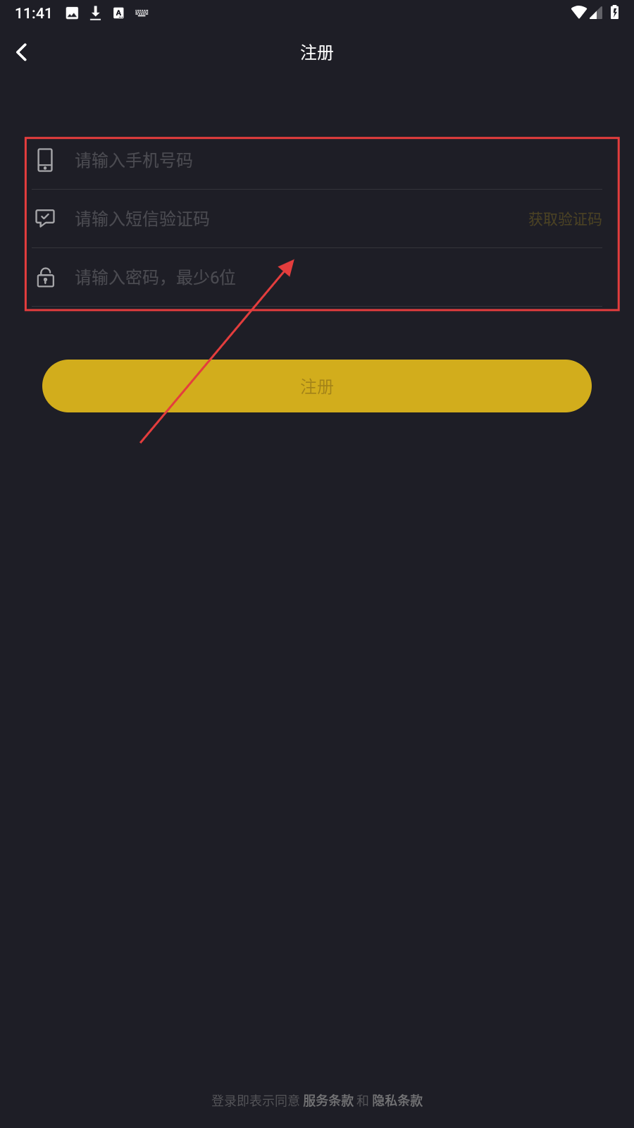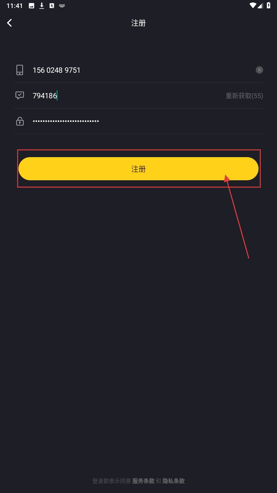 2、在注册页填手机号、点【获取验证码】,填收到的验证码、设密码。