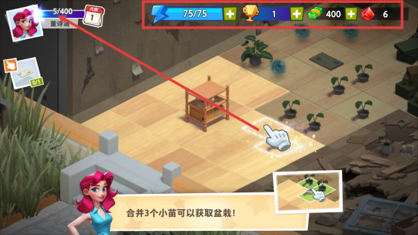 1、游戏开始,留意左上角角色任务进度,以及上方体力值、货币和奖杯数量。体力值用于执行合并操作,合理规划使用。