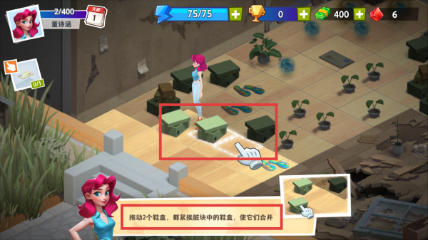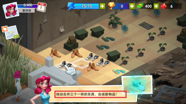 2、根据操作提示,如“拖动合并三个一样的东西,合成新物品!”,在场景中找到相同物品,将三个相同物品拖动合并,获取新物品。