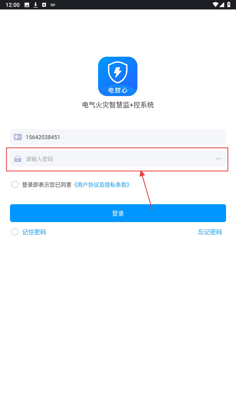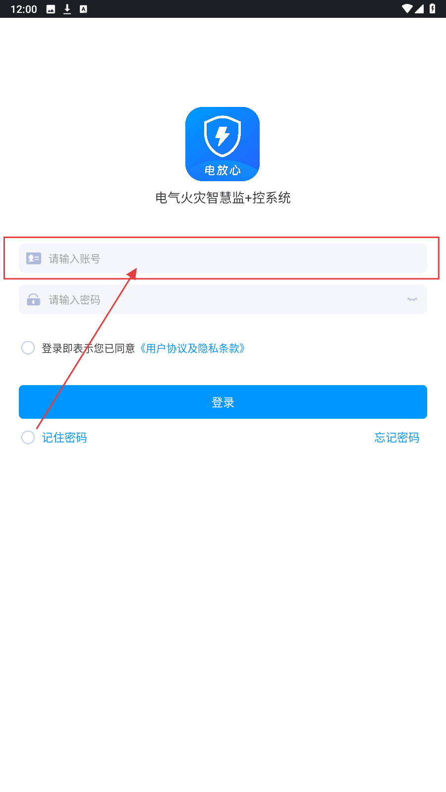 1、打开“电放心-电气火灾智慧监+控系统”登录页,在【请输入账号】框填账号。