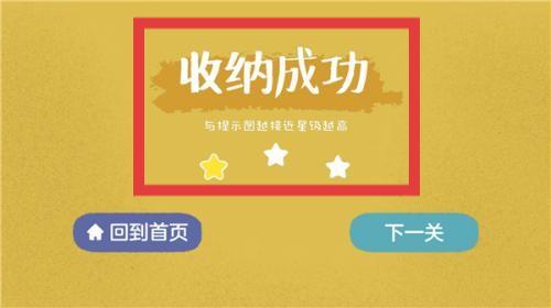 3、完成收纳后,出现“收纳成功”提示,可选择“回到首页”或挑战“下一关”,不断提升收纳技巧,解锁更多关卡。
