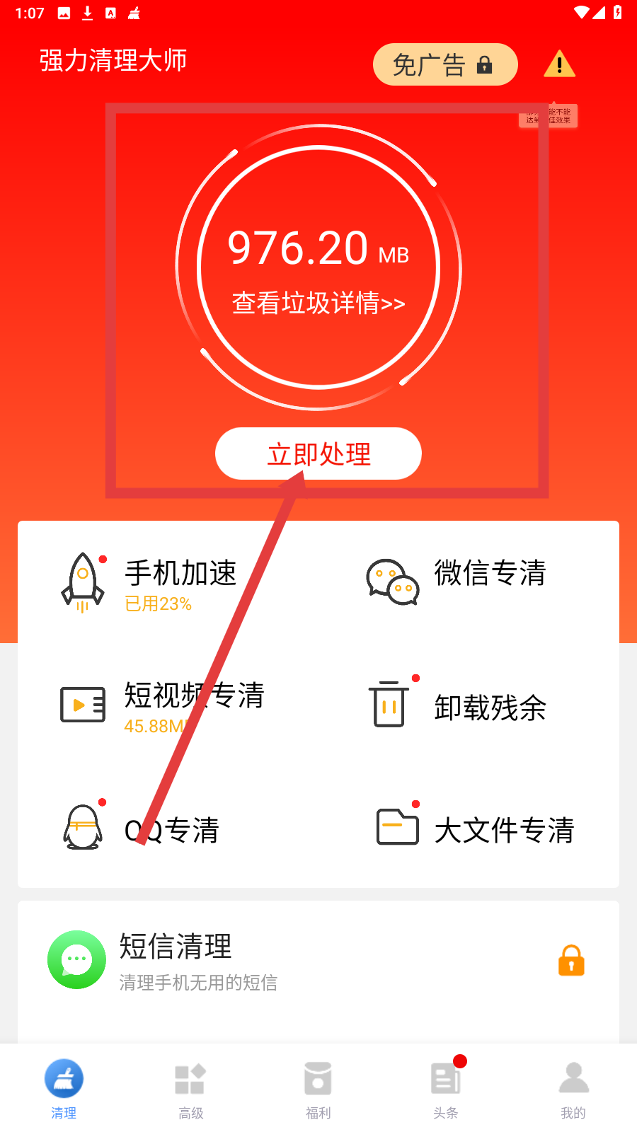 1、打开“强力清理大师”APP,首页显示976.20MB待清理垃圾,点击【立即处理】。