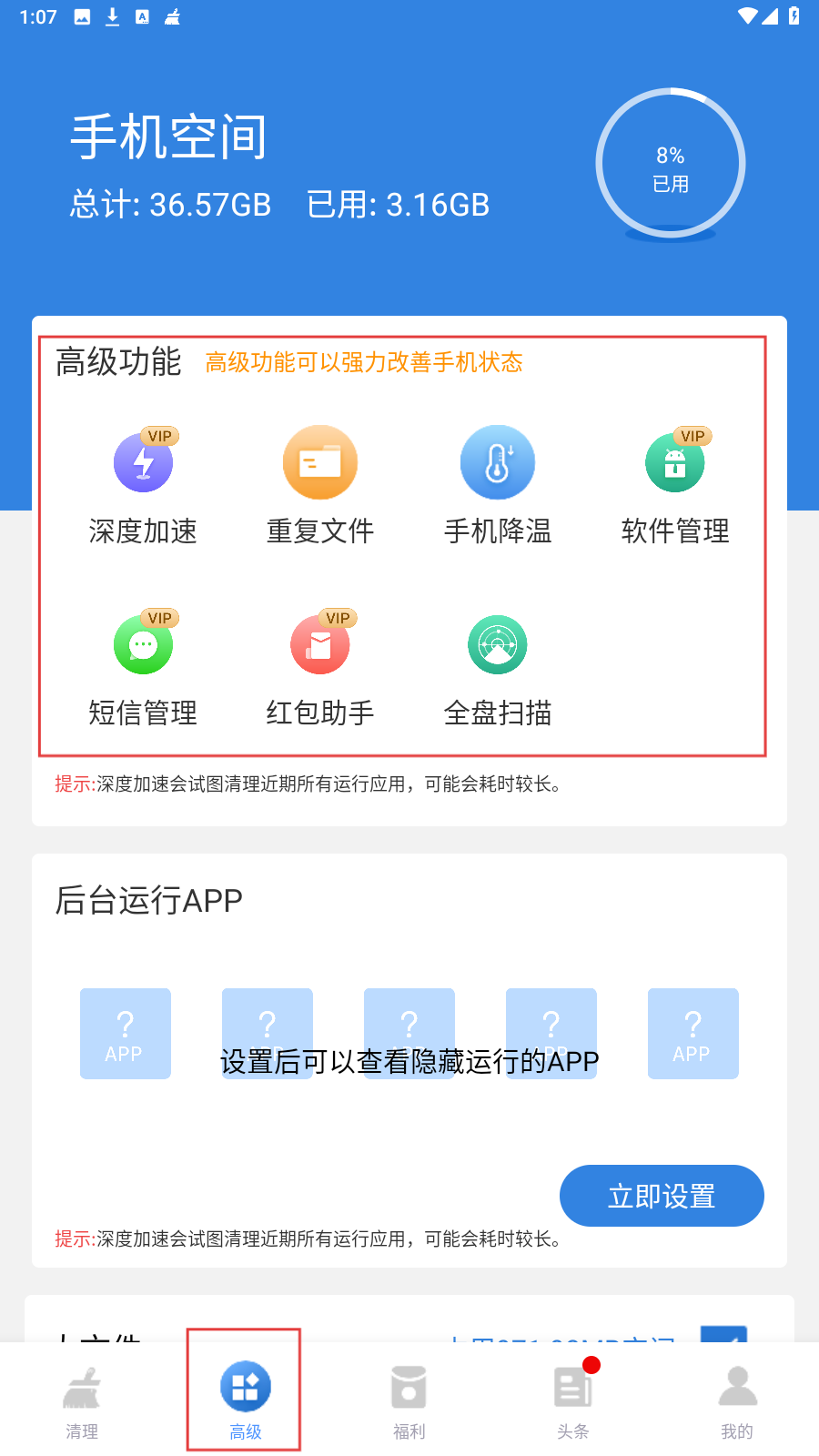 3、点击底部【高级】,可查看总计(36.57GB)、已用(3.16GB)空间,还有深度加速(VIP)等高级功能,按需使用。