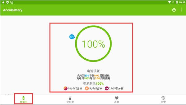 2、在【充电中】页,还可查看电池损耗(100%)、电池剩余及不同场景续航时长(18小时50分钟等),了解电池状态。