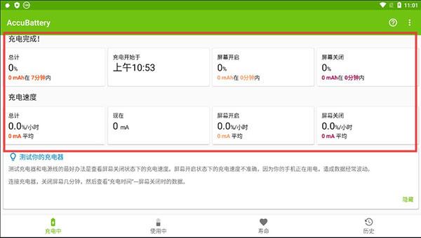 1、打开应用,在【充电中】页,可查看充电完成数据(如总计0mAh等)、充电速度等信息。