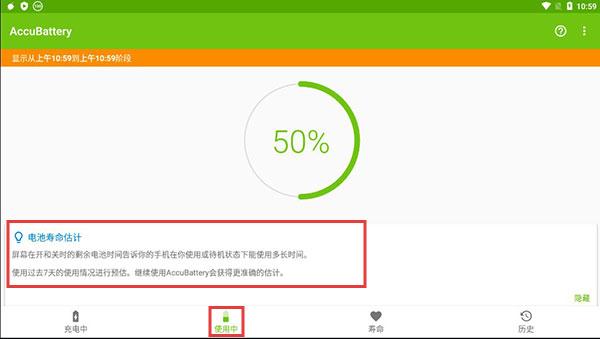 3、切换到【使用中】页,能看到电池寿命估计说明,依据过去使用情况预估手机待机时长。