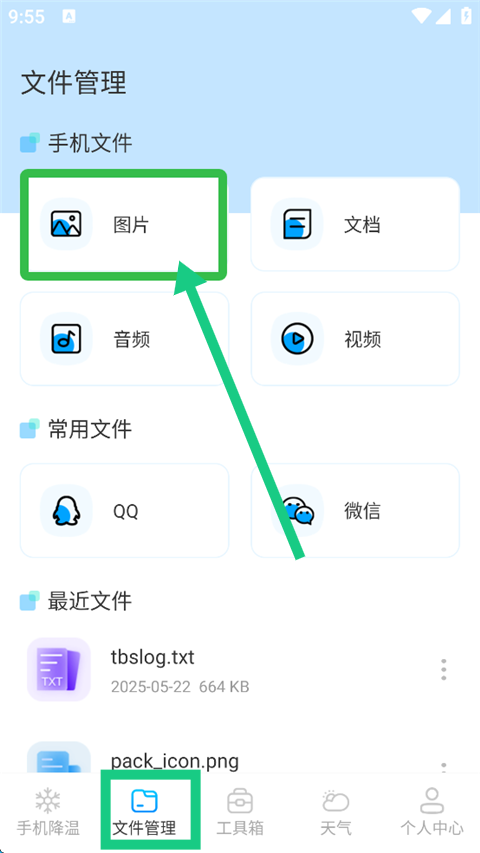 1、打开文件管理应用,进入【文件管理】页,点击【图片】分类,查看手机图片文件。