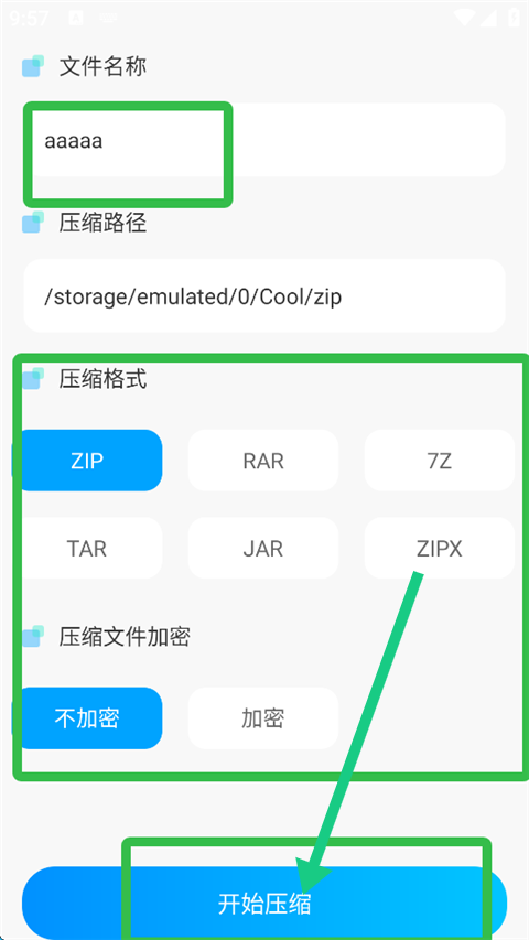 3、设置压缩文件名称、路径、格式及是否加密,点击【开始压缩】,完成图片压缩操作。