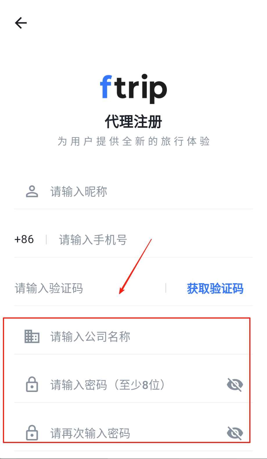 2、代理注册要填昵称和公司名,手机号格式同上,密码至少设8位数,验证码收完就能开通代理权限呀。