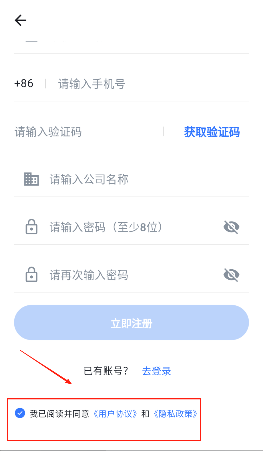 3、普通注册先输手机号收验证码,公司名称可填个人或企业,密码输两遍保持一致,勾协议框点立即注册完成哦。