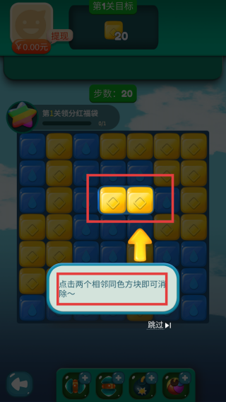 2、依据“点击两个相邻同色方块即可消除”的操作提示,仔细观察方块布局,优先消除能产生连锁反应或特殊道具的方块组合,提高消除效率。