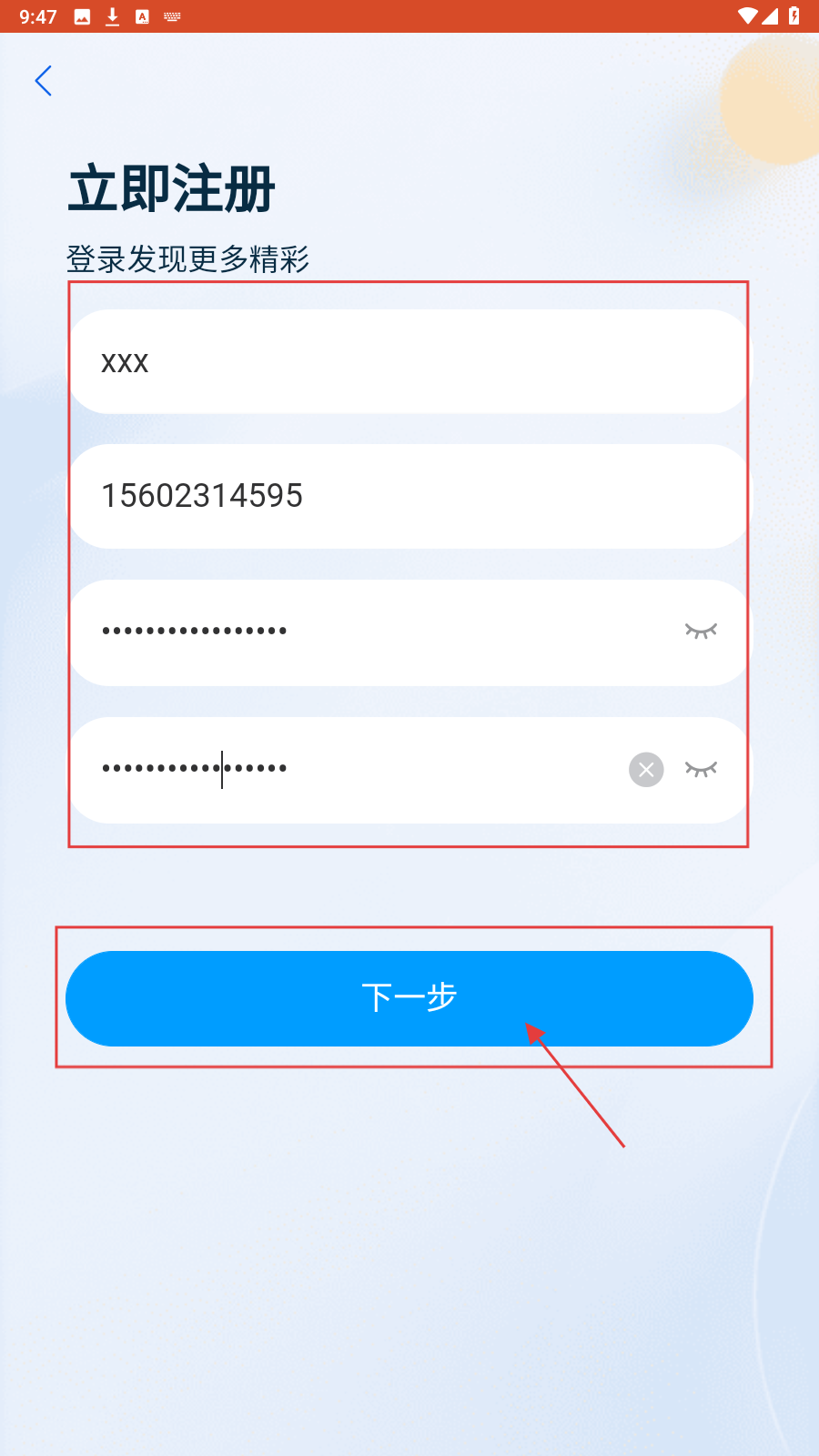 2、填写姓名、手机号、密码等信息,点击【下一步】。