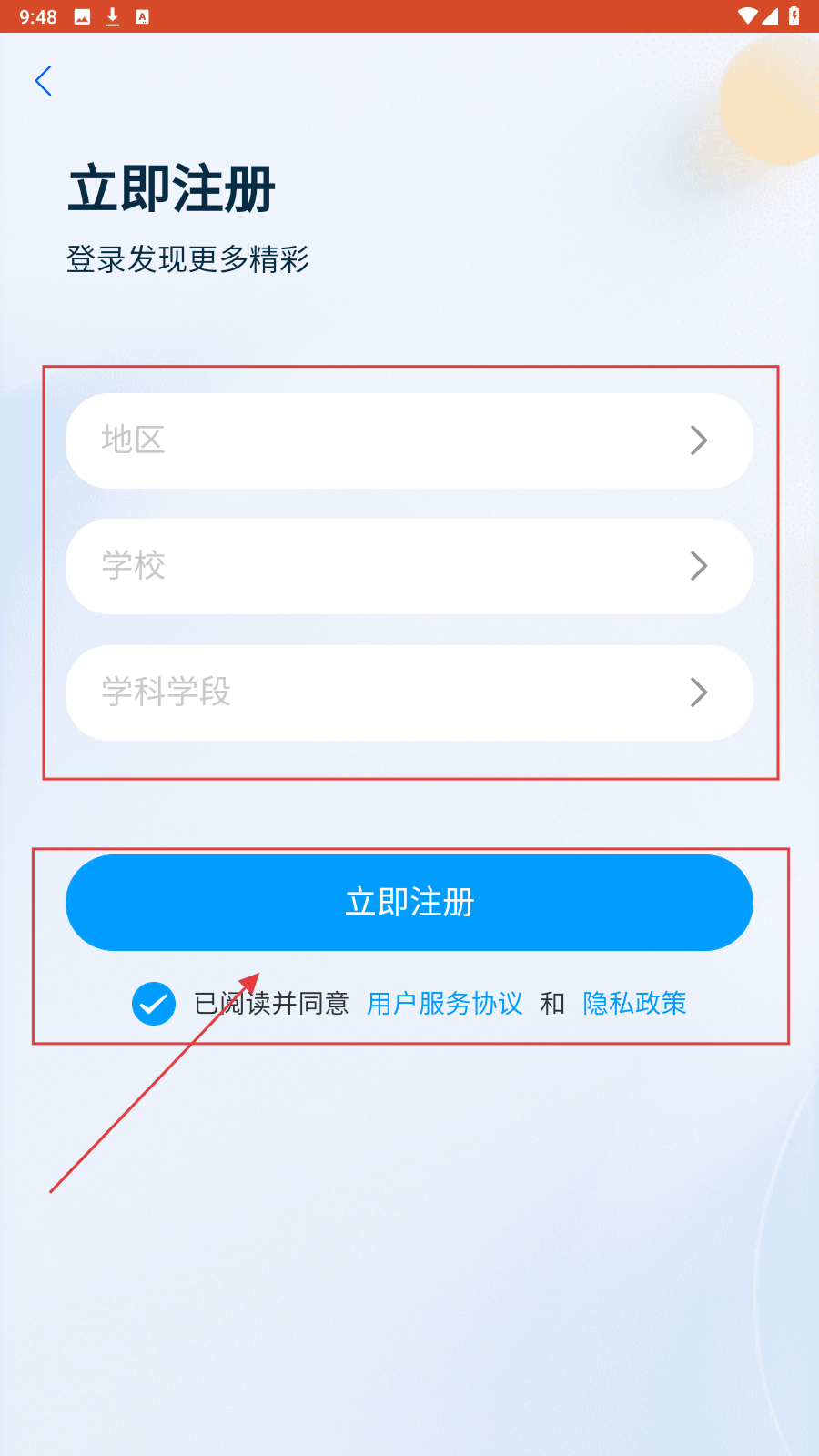 3、选择地区、学校、学科学段,勾选同意协议,点击【立即注册】,完成账号注册。