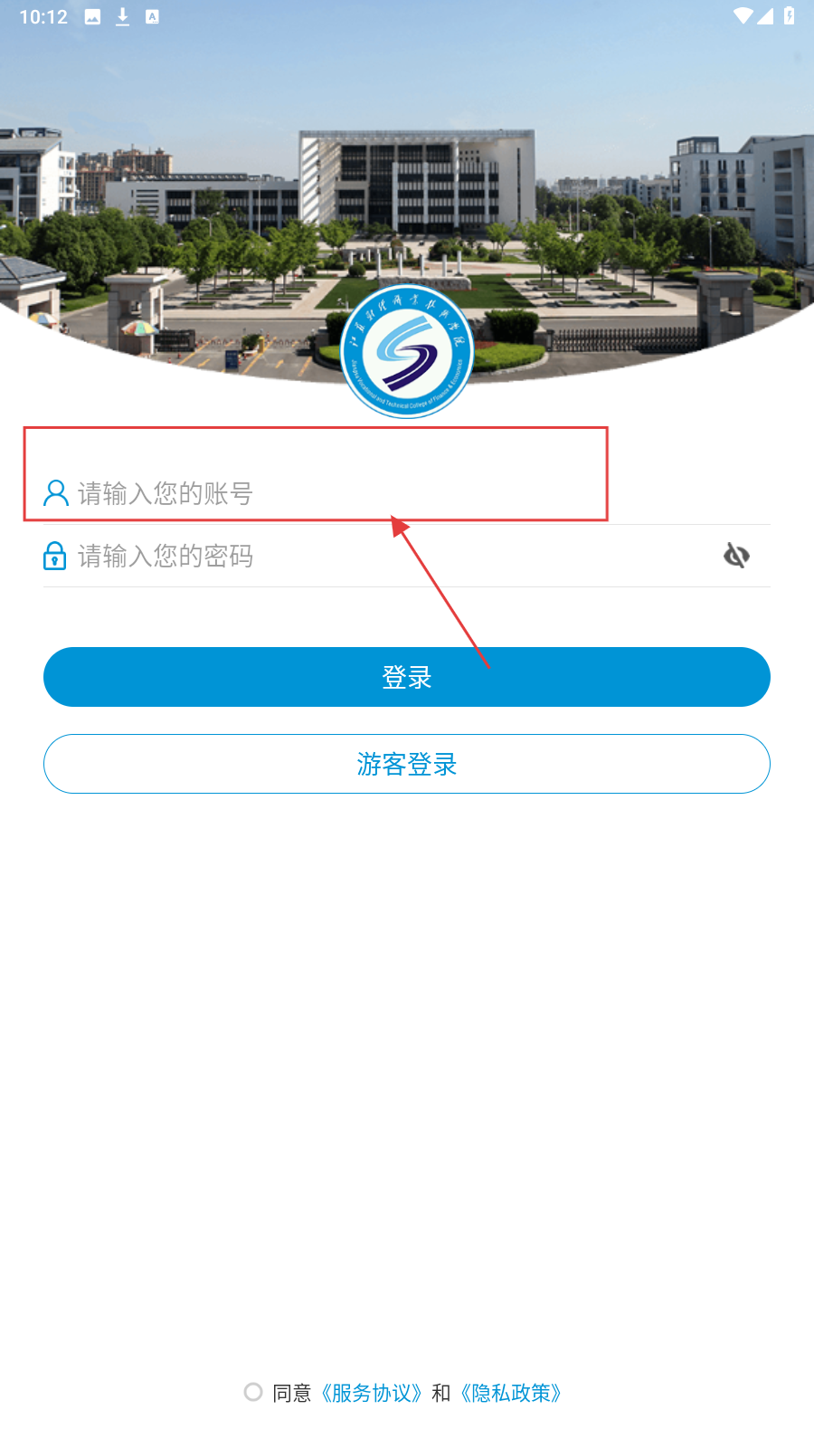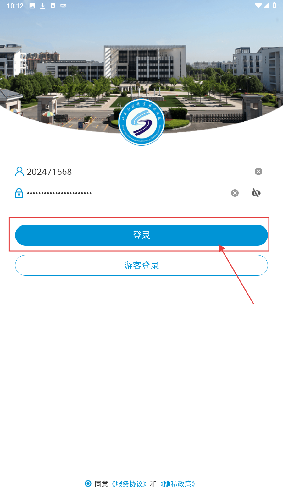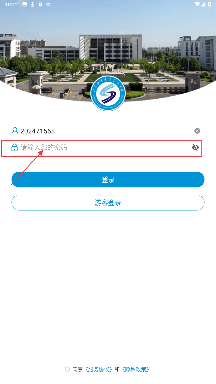 2、在密码框输入对应密码,勾选【同意《服务协议》和《隐私政策》】。