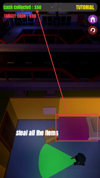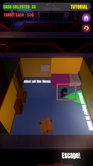 1、游戏开始,处于教程模式,按照“releasefingertohide”提示操作角色。控制角色移动,寻找房间内可盗窃的物品。