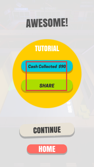 3、完成物品盗窃,达到或超过目标现金数后,根据界面提示,可选择“SHARE”分享游戏成果,或点击“CONTINUE”继续游戏。