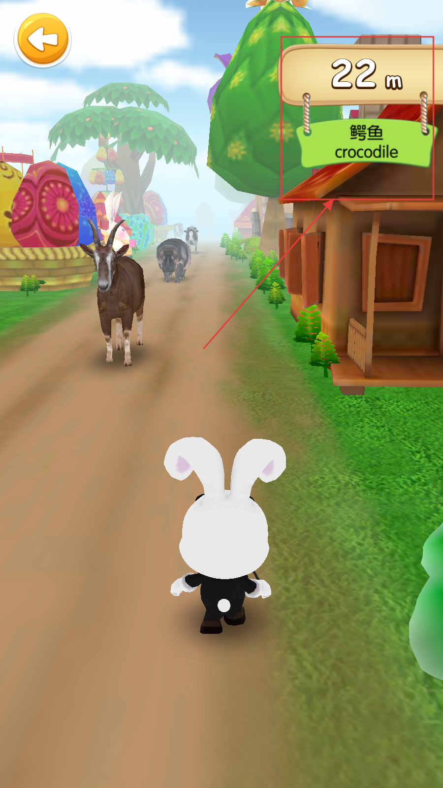 3、小兔沿道路奔跑,上方显示距离(如22m)及“鳄鱼(crocodile)”等标识,控制小兔避障前行。